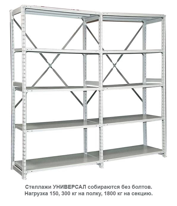 Металлические полки стеллажа отличаются высокой надёжностью. Максимум распределённой нагрузки на одну полку – до 150 кг, на весь стеллаж – до 1800 кг.